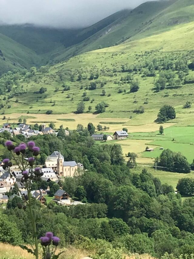 We have wandered up the climb, through the little towns, and again we start to hear the cowbells above us up the road. Please take the time to check out the towering mountains that rise toward the sky. We reach the top but being late in the day the cows have actually moved on to take shelter for the evening or for daily milking. We pause momentarily. We have conquered four out of five summits today. Our gaze is draw across the Louron Valley, toward the final climb of the day Col du Peyresourde. We move on and navigate our descent back to the town of Arreau at the base.